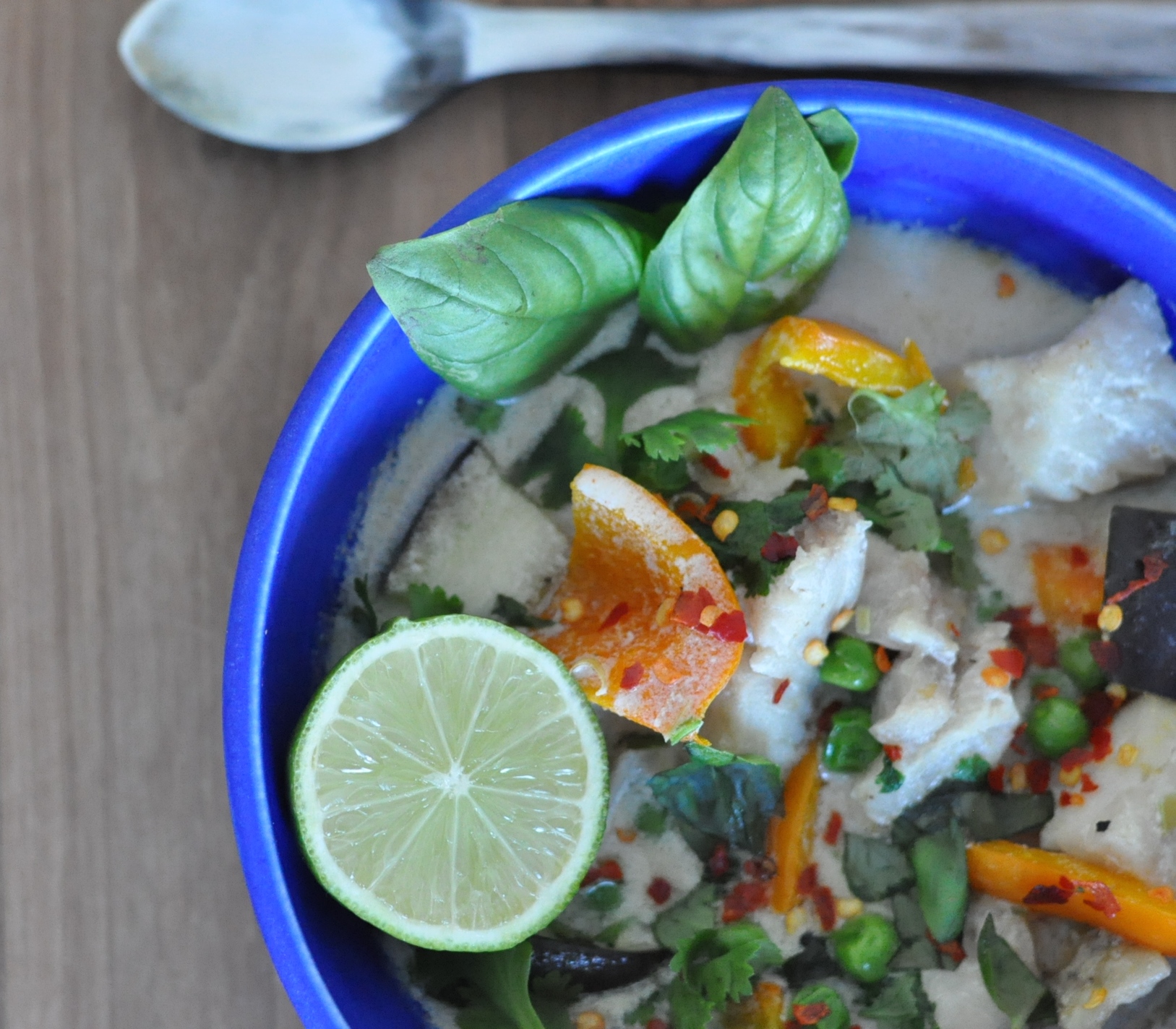 Ingredients: 2 fish fillets. 1 can coconut milk. 1/4 eggplant diced. 1 yellow pepper diced. 2 stalks lemongrass chopped. 2 handfuls of garden peas. Fresh coriander. Fresh basil. Mustard seeds. Fresh red chilli or dried chilli flakes. 1 Lime.