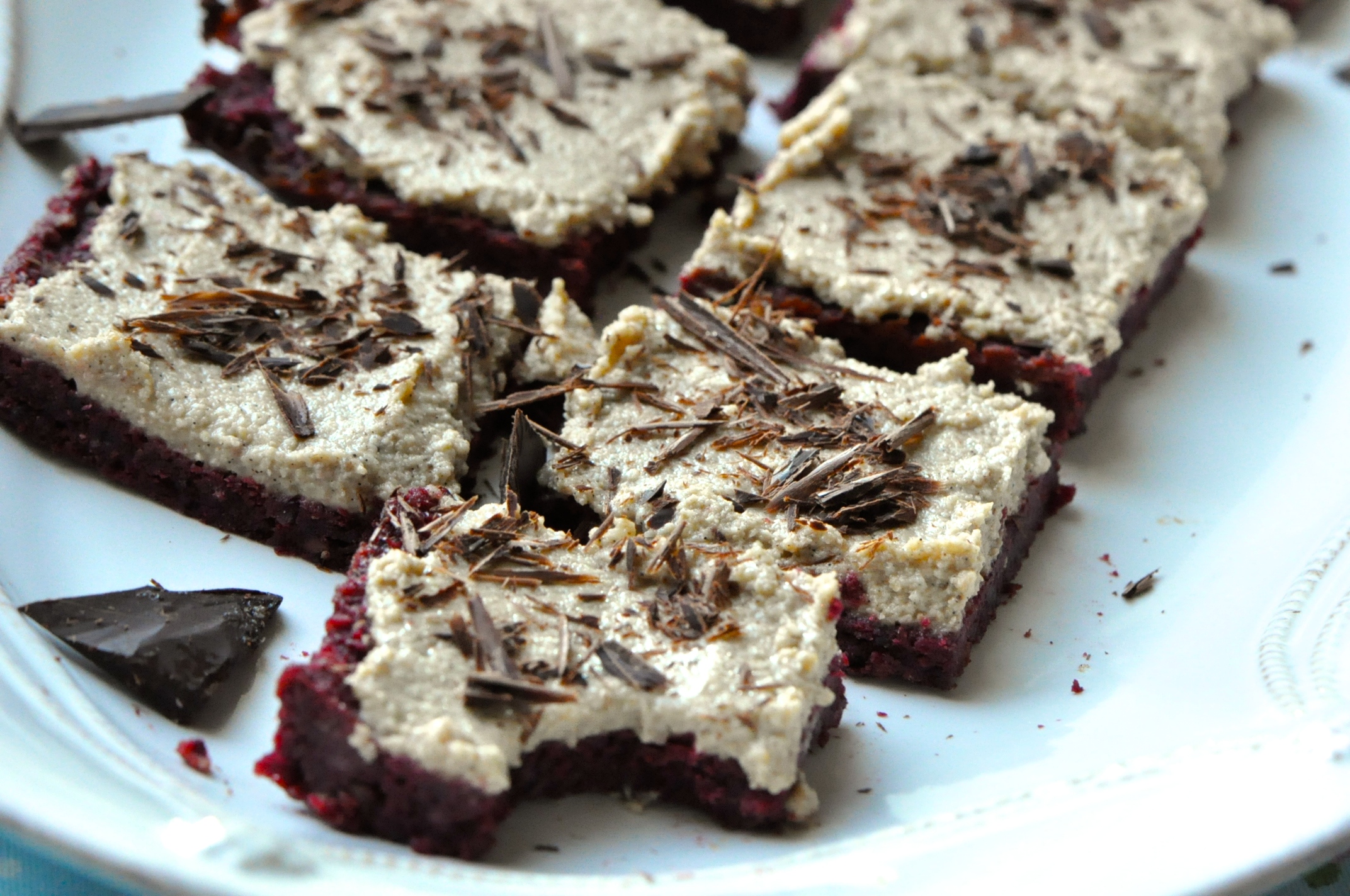 Brownies Ingredients: 1 cup raw beetroot chopped. 1/4 cup coconut oil. 1/3 cup agave. 2 tbs chocolate chips. 1 tsp raw vanilla powder. 1 tbs raw cacao. 2 tbs ground flaxseed. 1/2 tsp sea salt. 1 cup gluten-free rolled oats. 2 tbs coconut flour. 1/2 bar of 70% cocoa dark chocolate.