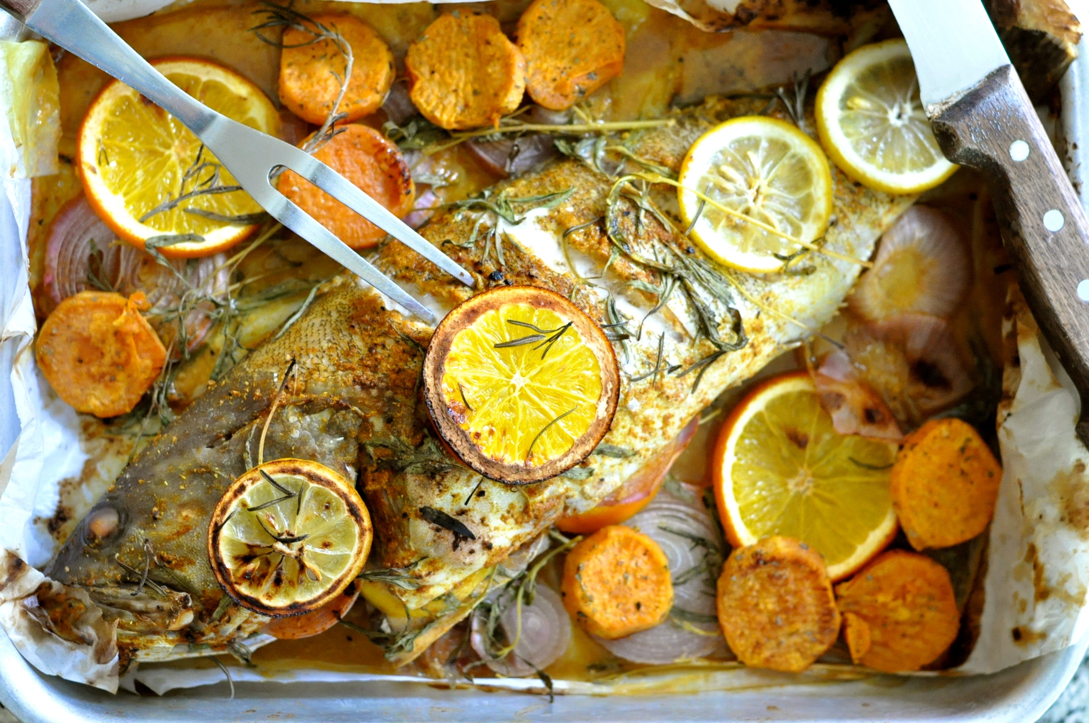 Pre-heat the oven at 250 degrees. Line a roasting tray with parchment paper. Place the fish on the tray and with a knife cut 3 slices on each side to allow the marinade to penetrate. Rub the marinade all over the fish thoroughly. Stuff some of the onions, thyme, rosemary, lemon and orange inside the fish, then scatter the rest all over. Cover with foil and roast for 30 mins. Remove the foil and roast for another 5 mins to achieve a nice brown crispy glaze.