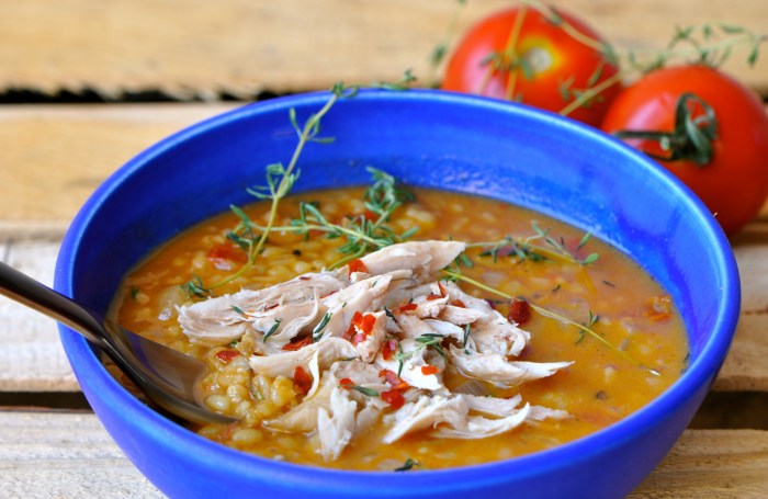 To serve, pour the soup into a bowl. Place some de-boned chicken in the middle. Garnish with thyme and chilli flakes. You now have yourself a lovely wholesome soup with even some chicken left overs for next day sandwiches!