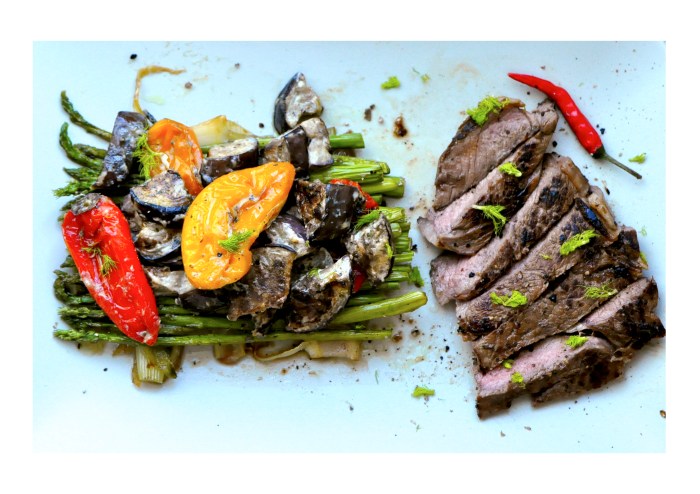 Serve the steak with the veg piled up on the side; fennel then asparagus then aubergines & peppers. Garnish with the leafy fronds.