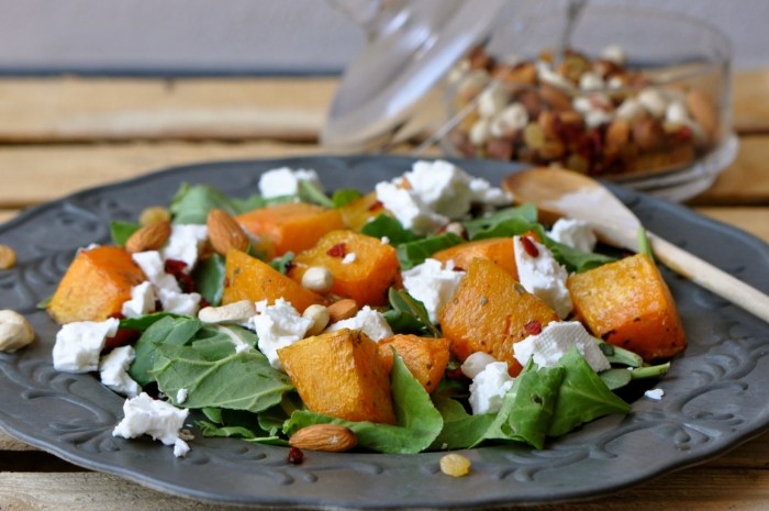 To serve, place the pumpkin on a bed of spinach. Throw in some Bulgarian sheep cheese, an assortment of nuts and a few