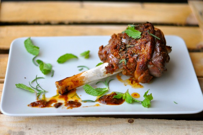 Pre-heat the oven to a low temperature of 180 degrees. Mix all the ingredients together in a bowl, except for the mint and chives. Make a couple of slits on each side of the shank. Marinate the shank, making sure you cover all the meat. Place the lamb in a cast iron pot and cover with a lid. If you don’t have a cast iron pot THEN GET ONE! It makes such a difference – it traps the heat and acts as an oven in itself, the meat turns out more tender. Roast for about an hour.