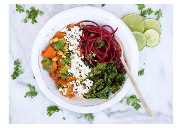 To serve: In a deep dish place some of the pumpkin/edamame mix on one side and the beetroot noodles and kale crisps on the other side. Squeeze the lime juice all over and top with feta cheese and fresh coriander leaves.