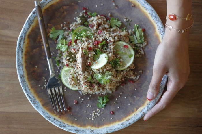 To cook: Heat a bit of oil in a pan then add the onions and garlic and stir until the onions are slightly softened. Add the chicken followed by half the lime juice, coriander powder, sea salt, ground black peeper and chilli flakes and stir for a few seconds. Then toss in the mushrooms and zucchini along with the vinegar and stir. Add the quinoa and half of the veg stock and cover the pan. Keep adding more veg stock as required until the quinoa is cooked. Once the quinoa has fully cooked and the water has evaporated, add the rest of the lime juice and pomegranate seeds and mix it all together.